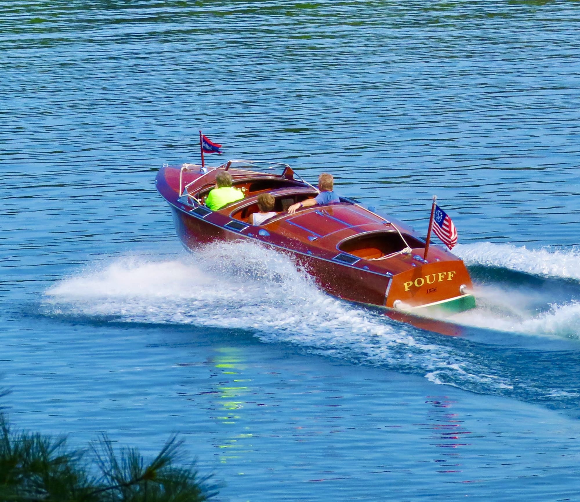 The block on the Nordberg flathead engine was cracked, so it was scrapped. David Taylor and his team had a 356 cc Chevrolet/Mercruiser V-8, producing 285 hp, installed in Pouff. The engine is naturally aspirated. The refit included a new redesigned dashboard, which the Turcotte’s of Brant Lake copied on newer GarWoods. The throttle on the steering wheel was removed and replaced with an aircraft-style push/pull throttle. A dual exhaust system was installed, and the original electrical design was replaced with a modern 12-volt system. And the Naugahyde upholstery was replaced with genuine leather, using hides found in Oklahoma. Lastly, all of the deck hardware was re-chromed. Pouff was now looking like new.