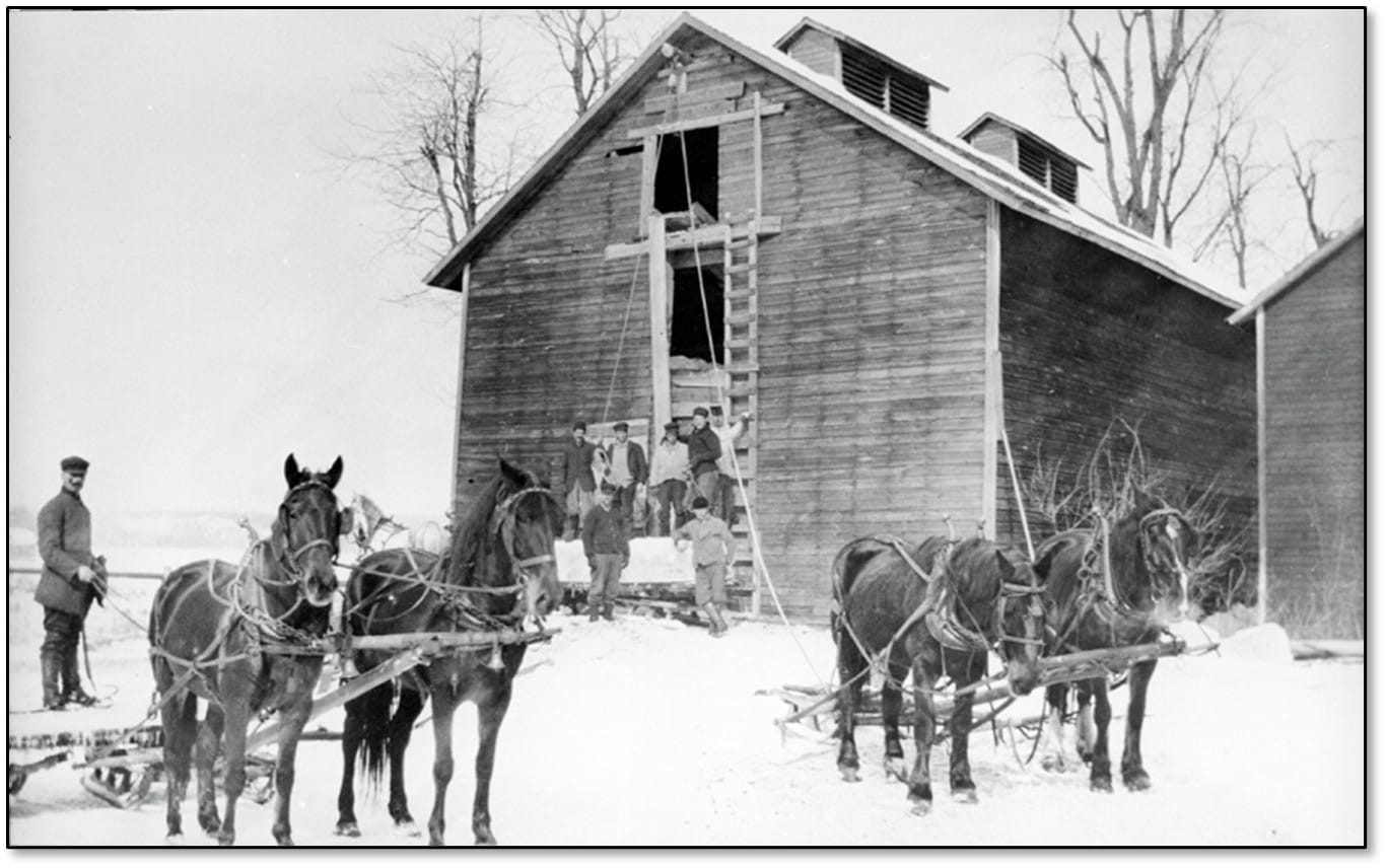 Keeping food cold was equally challenging. The earliest ice boxes were simple wood boxes, lined with tin or zinc and cork, and used sawdust or straw as insulation. A pan in the bottom of the ice box caught drips, a shelf near the top held the food, and the rest of the box held a big piece of ice. Thousand Island Park had a two-story icehouse that held large slabs of ice cut from the River in the winter, hauled by horse-drawn sledges, and propelled to the second story via a lift, where the ice was stored from winter through summer, between layers of sawdust. When a customer needed ice, a carter was ready with a saw and large tongs to cut and move the ice block to the cottage.