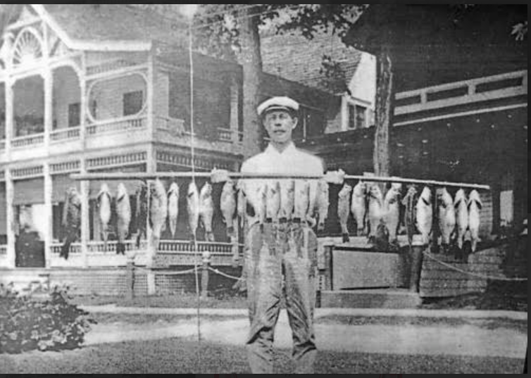 L: 1918, “Catches of the Day in TIP” Newspaper photo taken on Coast Ave. West near Ontario Ave.; R: The TI Park Community Ice House. c