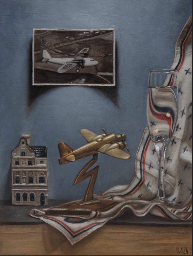 From her composition, I linked all the elements to my narrative. The model airplanes she built with her father became the plane my hero would fly, the scarf a gift he would give to a special lady, and the Delft Blue house, the link to the Netherlands. Here is the story that emerged from the small canvas.