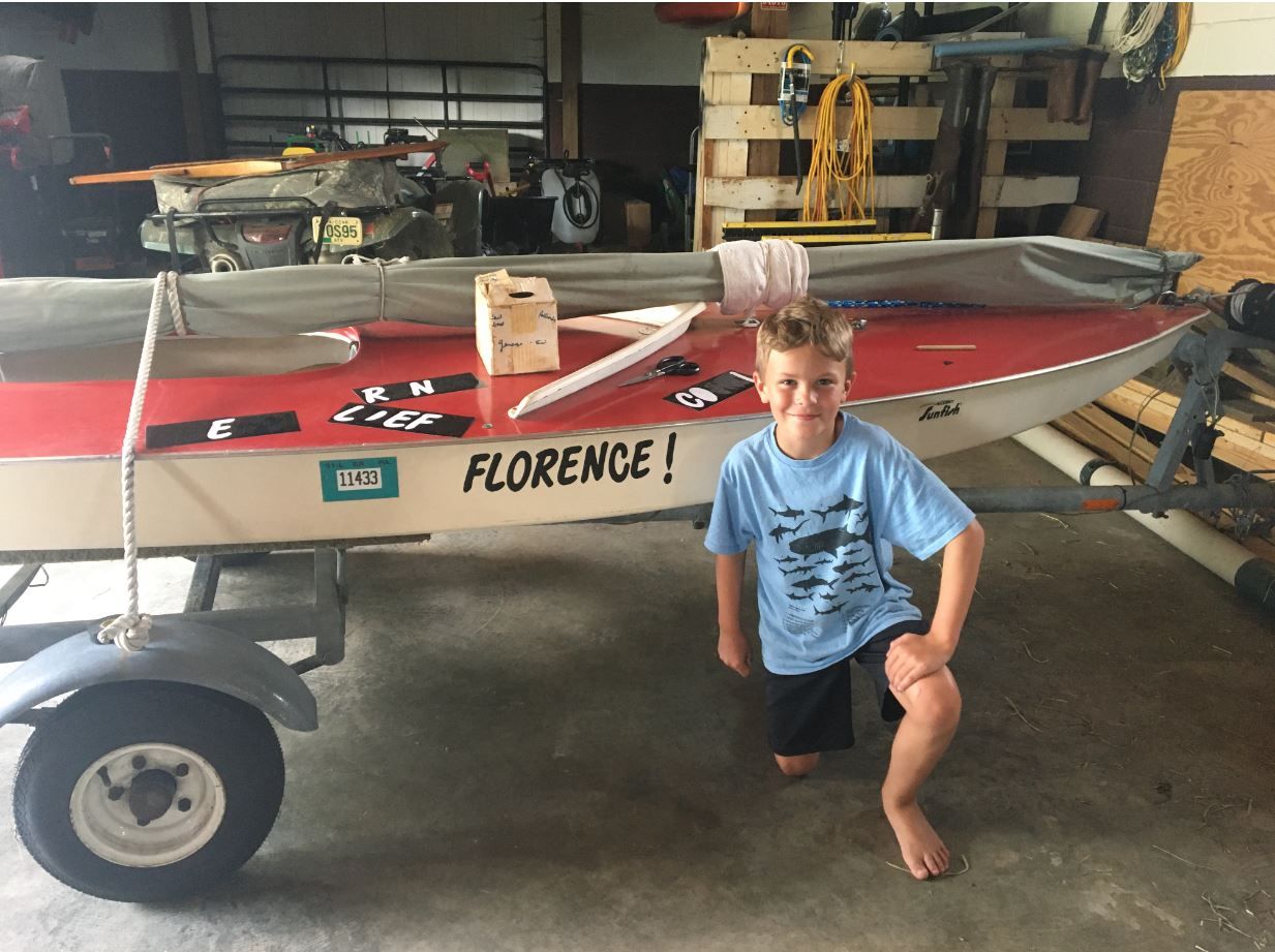Lee was very excited to see his new boat. We decided to pull the boat and trailer into the middle of the yard and rig the sail. I realized that I had retained very little of what I observed when David had her set up in his driveway. I got online and watched a few YouTube videos about rigging a Sunfish. There was an immediate problem with the confounding terminology. Main sheet? Halyard? Mast ring? Spars? Fair lead? I felt like I was listening to someone speak a foreign language! So we rigged her up the best we could. I plopped Lee in the boat and let him practice holding what I was pretty sure was called the main sheet, and then duck under the boom a few times when it swung over and caught the wind. I attached the rudder and Lee pulled the tiller back and forth a few times, pretending to steer the intrepid Florence through an imaginary storm. I was pleased with our efforts and took a minute to snap several pics and text them to David, who politely pointed out that I had a few things kind of backwards. I was glad I sent him those pics!