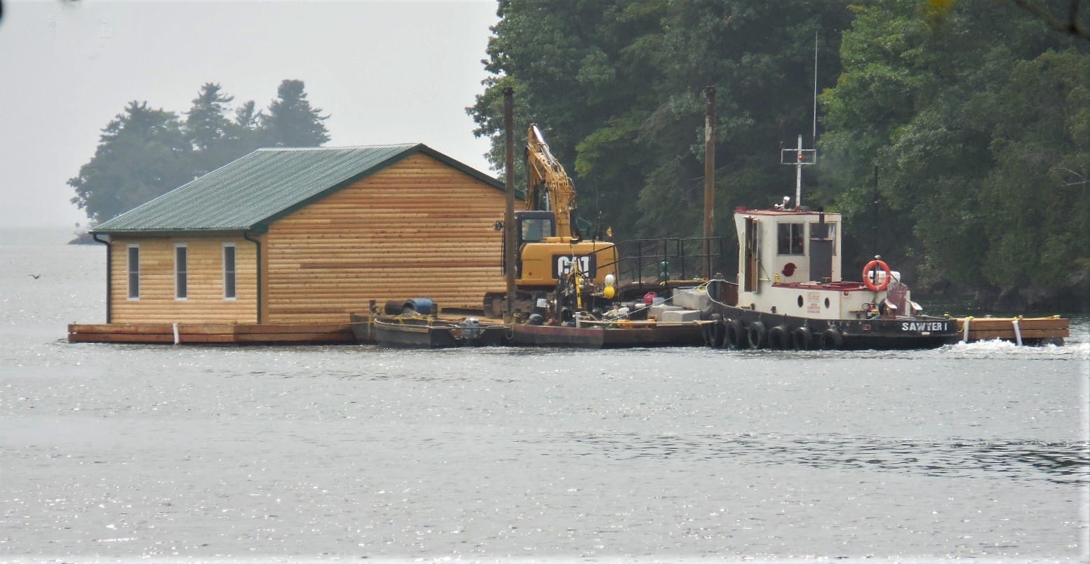 Imagine looking out on a drizzly day and seeing a boathouse coming straight toward your island before it curved off into Wanderer's Channel. Yikes! Some deliveries are bigger than others! Good thing it wasn't windy or the tugboat would have had a lot harder job. This is an event of a lifetime. Next day was a bit windy, but with some poking around I found the floating boathouse's new home and watched some of the work needed to install it. Fast forward six years and another floating boathouse went by the Joel Stone Park – so, not an event of a lifetime, but still an unusual event.