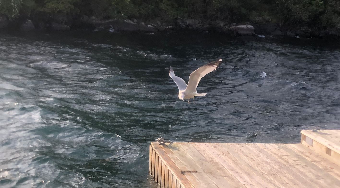 It began one bright, blue, late summer morning in 2017, a year with a highwater level that was receding as fall approached. At breakfast, we noticed a ring-billed gull perched on a newly reappearing rock just off our lower dock. When breakfast was over, a piece of toast remained untouched on the table. My dear friend, JBJ, arose, grabbed it, sauntered out on the high rock above the water, and began throwing morsels to the gull. It flew over, swooped down, and gobbled the crumbs on the water. As she threw the crumbs, she spoke to the gull. The next morning, the seagull was back. She went out, fed it again, speaking as before, and then, again, on a third morning.