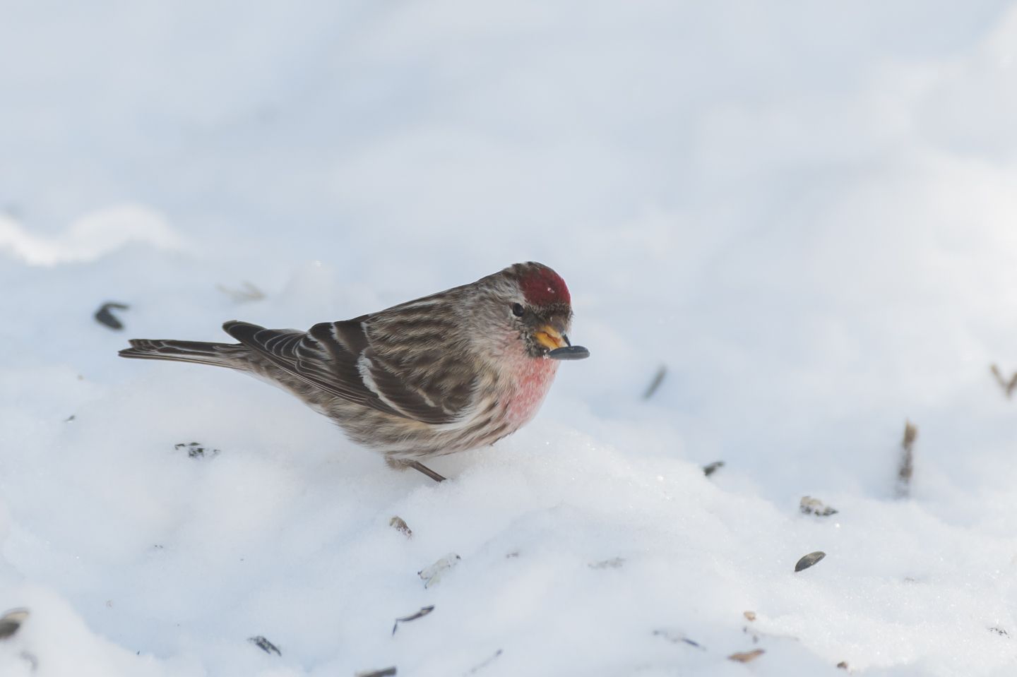 The Common Redpoll is a small Arctic finch that nests in the Boreal Forest and Tundra Regions of both the old and new worlds. Along with its close cousin, the Hoary Redpoll, these birds form a taxonomic complex currently driving serious birders and academic ornithologists to distraction. Recent DNA analysis suggests that what we now think of as two species may comprise as many as five or six. Since redpolls have highly variable plumage by age and sex, sorting them out is already a daunting task. Those observers wishing not to risk precious sanity are probably best to consider all redpolls in flocks as the same species. We can enjoy these entertaining little finches when they descend on our feeders and not be at all concerned with their family tree.