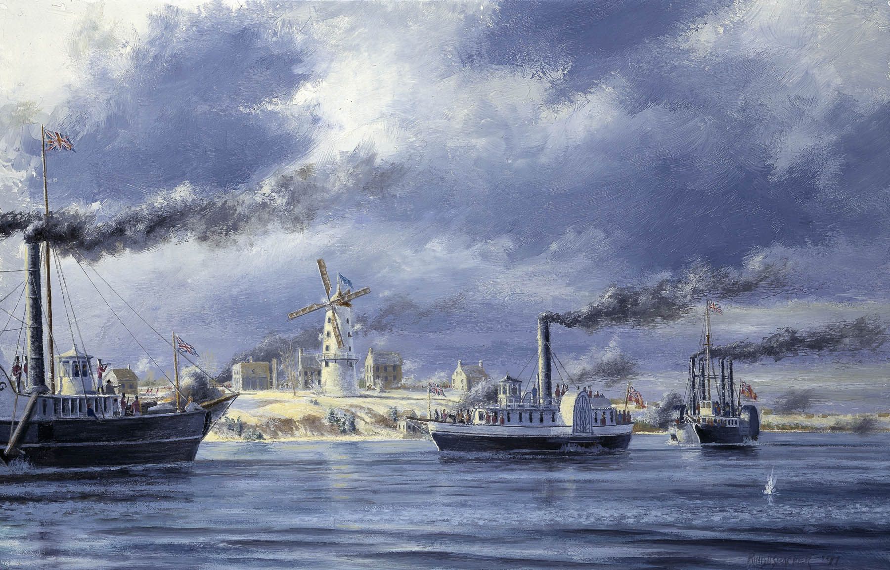 After a time, one of the schooners dropped down the stream about a mile and a half opposite to a windmill, and commenced landing her men and arms. The United States also steered in that direction, when the Experiment fired a cannonade at her as she passed; but deemed it far from prudent to leave the town [Prescott] unprotected. The rebel steamer ran alongside the schooner, and commenced landing men.