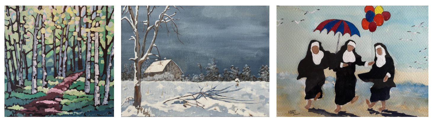 Mike Hart; Michael explores landscapes and water related shapes using watercolor and acrylic mediums. Always striving to find a loose watercolor style, Michael often dabbles on the edge of abstract in his art. He has also developed a fan base for his playful paintings of nuns!