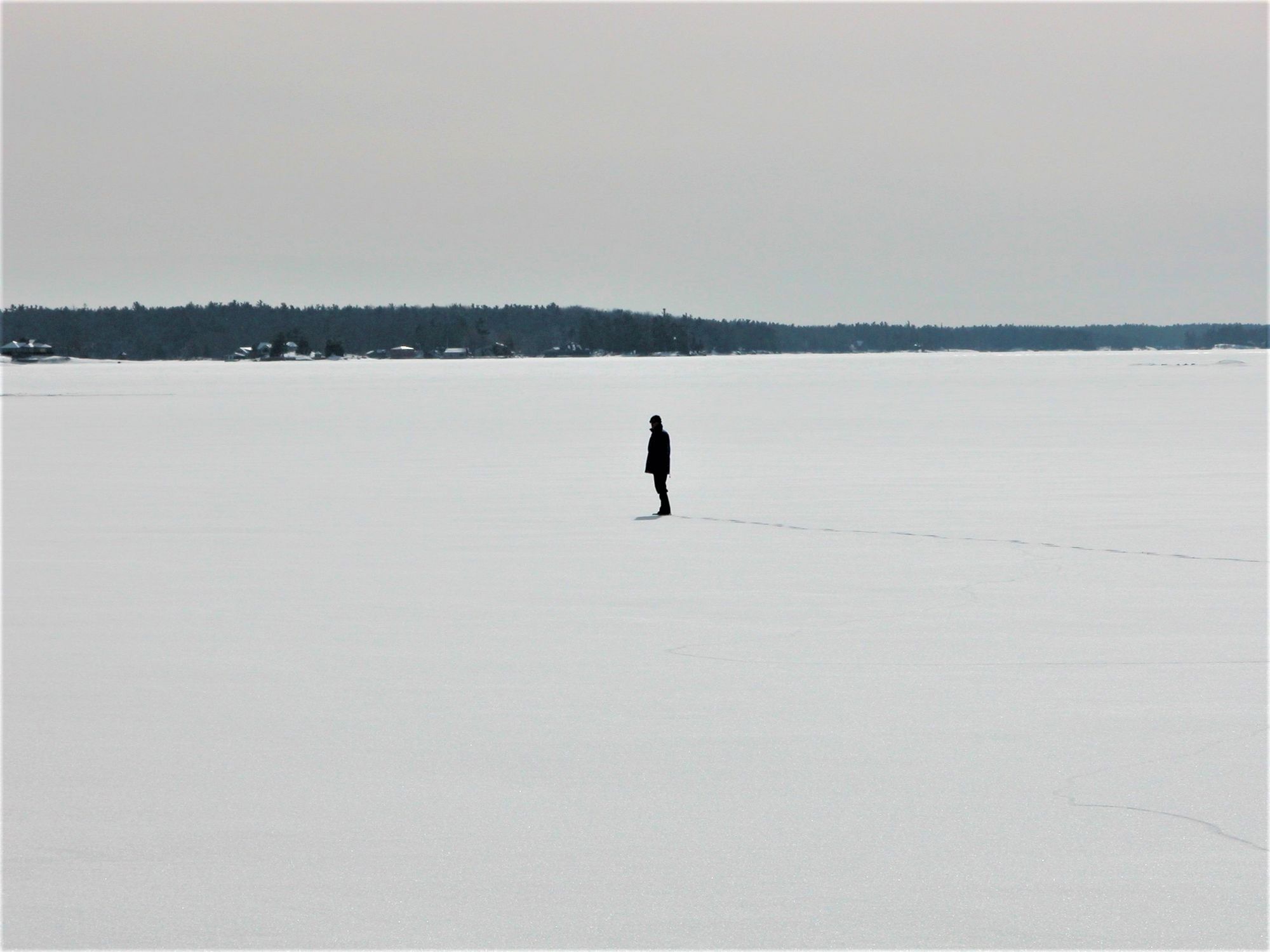 Off to camp Julie and I flew in late February. We parked up above the steep, narrow, one car wide hill leading down to the gravel, half mile dead end camp road. We feared we would not be able to get down it safely in the snow, nor back up. We hiked down to camp and found a winter wonderland. Everything, everywhere, was white as far as we could see. Mostly overcast, flurries, cold, breezy. Pure white. We learned the next day that Chippewa Bay ice was over 30 inches thick.