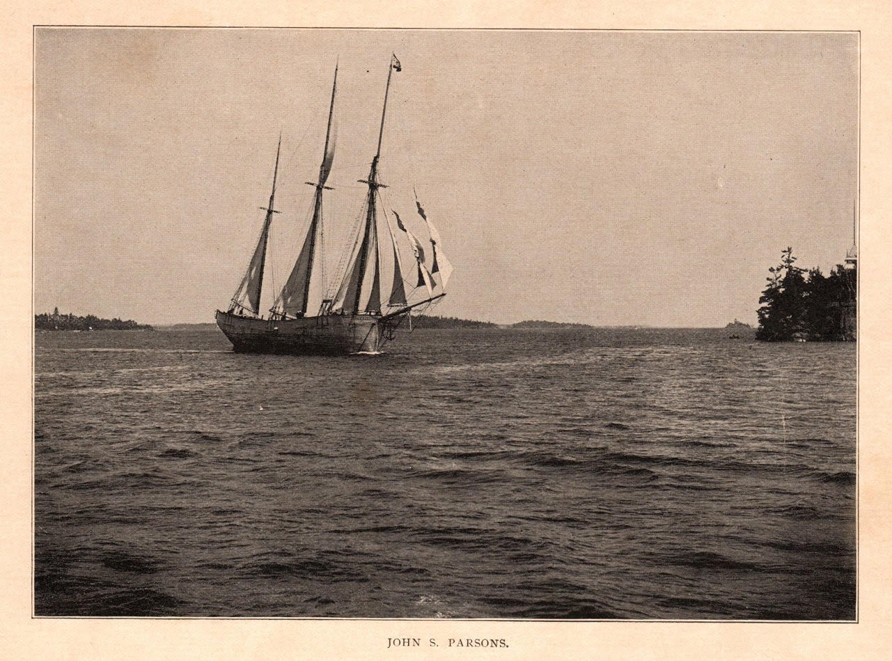 While there, he noticed a new three-masted schooner tied up, its snow-white paint glistening in the sunlight and its equally white sails furled along the booms. The schooner was the John S. Parsons, built in a shipyard at Chaumont, Jefferson County, by Captain Frank Phelps. It was Captain Phelps’ second schooner, his first having been the Emma.