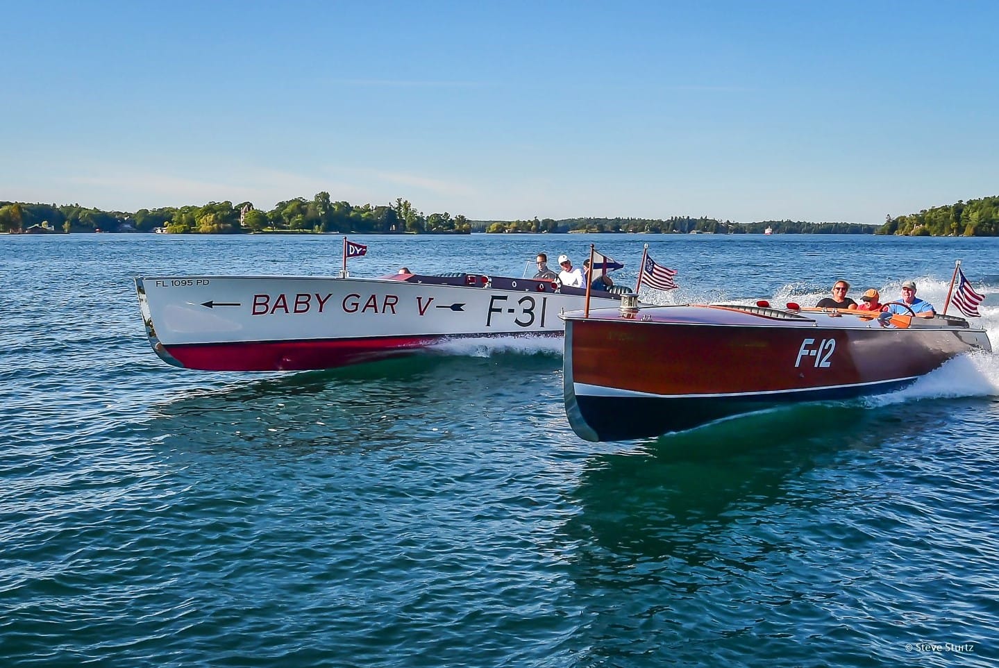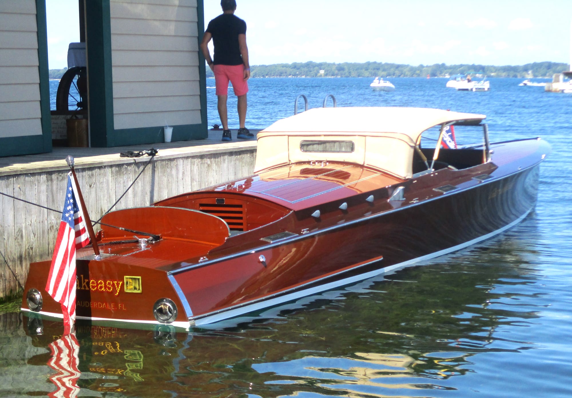 A few years ago, Victoria and Bob Banister brought Speak Easy to two classic boats shows in the Thousand Islands. Speak Easy has an elegant canvas convertible top with wood and chrome struts. Her small rear window is reminiscent of the limousines from the Roaring Twenties. While she looks like she needs a chauffeur, don’t let her elegant looks fool you. Speak Easy is driven by twin big-block V-8’s that can propel the boat up to 52 miles per hour, according to Bob. At the Antique Boat Museum’s ‘Need for Speed” show, the Banister family raced Speak Easy around the racecourse at an amazing clip. Of course, the convertible top was retracted for this show of speed and the crew waved at the spectators on shore at the ABM.
