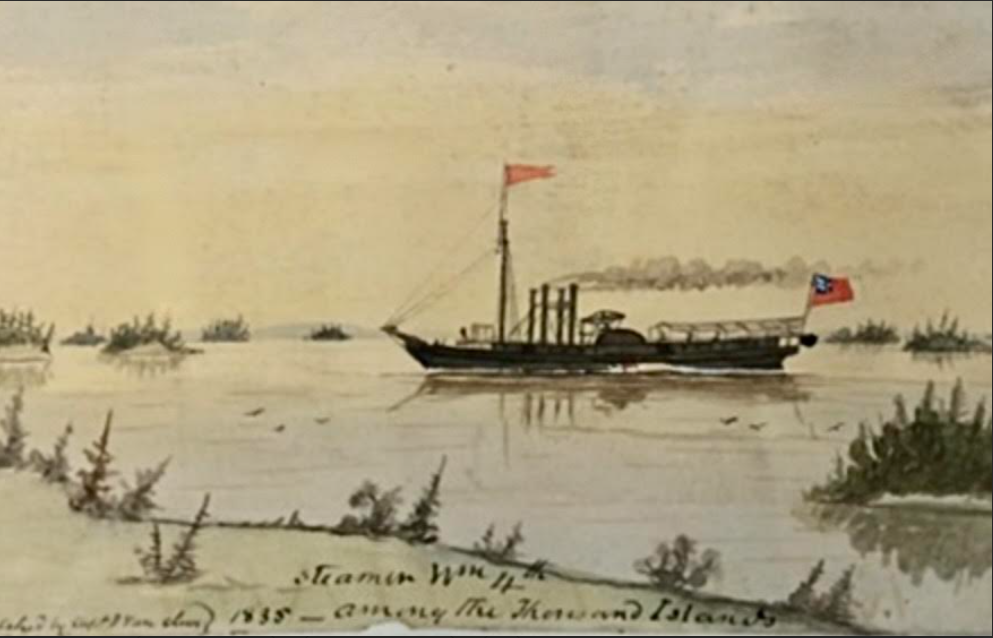 “At the conclusion of that war, he returned to England, and was placed upon half-pay; but his active habits led him to consider and study the powers of the steam engine, and he soon made himself acquainted with its complicated machinery. In the year 1816, he returned to Kingston, and assisted in fitting up the “Frontenac,” the first steamboat used on the waters of Upper Canada, which he commanded till she was worn out – since he has commanded the “Alciope” on this Lake, and at the time of his death was engaged in the construction of two other steamboats, one at the Head of the Lake, and one at Lake Simcoe; and he was on most occasions consulted respecting the construction and management of steamboats, so that he may be justly called the father of steam navigation in Upper Canada.”