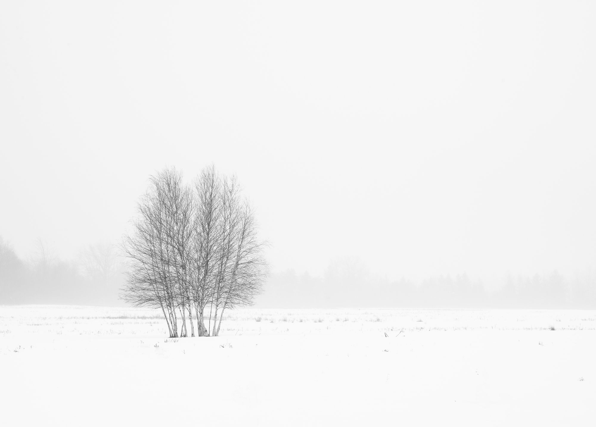 On this particular morning, a light fog blanketed the scene. From a technical standpoint, this was a simple photograph to capture. I somewhat overexposed the scene, to emphasize the bleakness and help hide the tree line in the background. In processing, I “burned” (darkened) the stand of birch trees slightly to add contrast. The decision to render the scene in black-and-white was mostly moot as there was little color to begin with, a condition not uncommon in winter.
