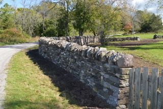 We began by hand-bombing every stone into a row or a pile, depending on its shape and purpose. Next, the soil was raked, and a new foundation of large stones set in place. A “cheek end” was built where the wall section ends, and we each took a section. facing each other along the wall, and placing “one stone over two, two over one,” we built up each “course” or layer until we reached the appropriate height as measured on a “batter frame.” A finishing layer of stabilizing “coping stones” was placed on top and the wall that I could not imagine being reassembled so quickly from all those parts was ready to withstand another hundred or more years of the ravages of time.