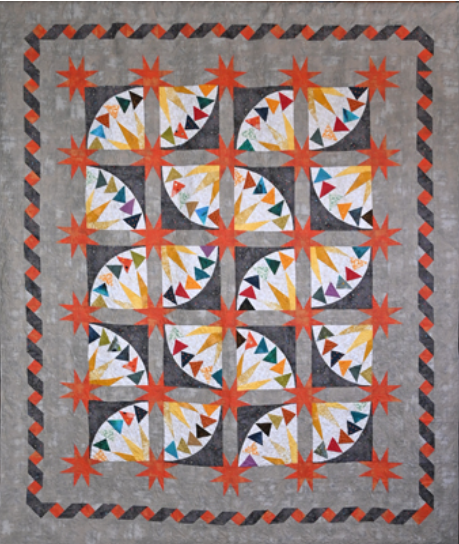A bit of a mystery surrounds a quilt that first appeared on Pinterest; it caught quilters’ attention and they began searching for the pattern. Depending on the source, the design was created by members of a quilt guild either in Austria or Australia. (The informal consensus seems to be Austria.) The original quilters, however, did not write out the instructions for making their blocks. As the story goes, after numerous inquiries about the pattern, a quilter and shop owner in North Dakota pursued and received permission to recreate the design and copyright the pattern titled “Flying to the Stars.”
