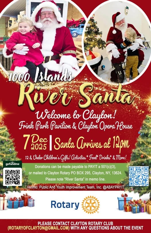 Join the fun on Sunday, December 7, 2025, as the 1000 Islands River Santa arrives in Clayton at 12 PM! The event will be held at Frink Park Pavilion & Clayton Opera House. Bring the kids (ages 12 & under) for gifts, activities, food, drinks, and holiday cheer! It’s a magical North Country tradition you won’t want to miss. This event is brought to you by the Clayton Rotary Club and the Public and Youth Improvement Team (PAYIT) — helping spread joy to local children and families all season long.