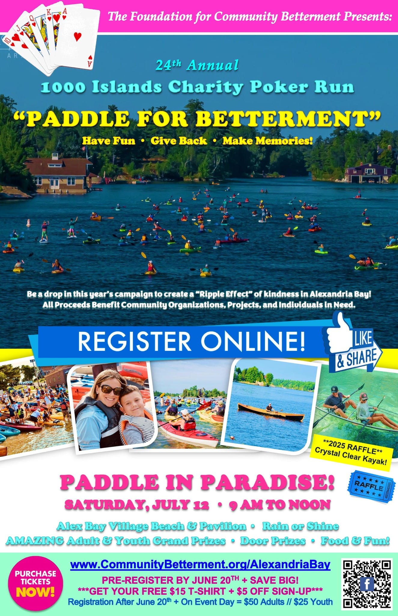 About The Foundation for Community Betterment: The Foundation for Community Betterment is a network of individuals dedicated to creating positive impacts within our local community. Through events like the Paddle for Betterment Poker Run, we aim to foster a culture of giving back while having fun. Our mission is to create a Ripple Effect of kindness, one simple gesture at a time. Paddle for Betterment is part of Community Betterment Weekend held annually in Alexandria Bay. The weekend kicks off on Friday, July 11th with a Golf and Tennis tournament, followed by a “Welcome Party” at Bonnie Castle Resort from 5:30 to 7:30 PM.
