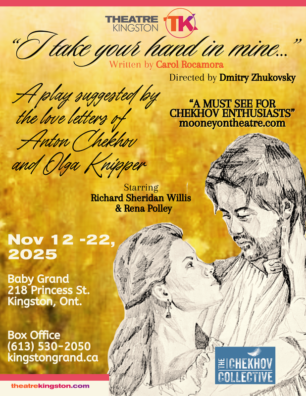But first, from Nov 12 – 22nd, in collaboration with the Chekhov Collective, Theatre Kingston brings you I Take Your Hand In Mine by Carol Racamora. Starring Theatre Kingston Alumni, Richard Sheridan Willis (who we loved in Boy Beatle, These Deeds and Happy Days) and the Artistic Director of the Chekhov Collective, Rena Polley. This is a play suggested by the love letters of Anton Chekhov and Olga Knipper and traces the passionate relationship between the world-famous dramatist and Russia's leading actress.