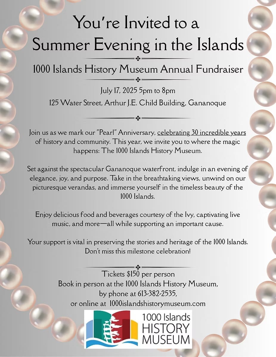 Join us as we mark our "Pearl" Anniversary, celebrating 30 incredible years of history and community. This year, we invite you to where the magic happens: The 1000 Islands History Museum. The "Summer Evening in the Islands" will be held at the Museum on Thursday, July 17, bfrom 5 PM to 8 PM.