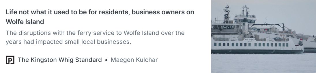 For those in the Thousand Islands, issues of living on an island are of interest to all of us. But those on Wolfe Island (south of Kingston), living on the island has meant frustration, delays, and concerns. On Friday, March 6, 2026, The Kingston Whig Standard published a poignant story about the loss of business over the past year, due to the ferry service. We encourage our readers to take the time to read this article. The more publicity, the better, in the hopes that public awareness may make a difference.