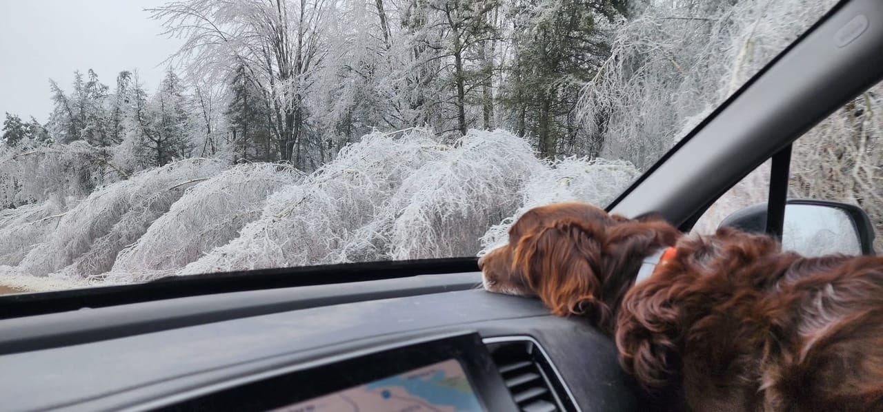 L: Ted Mowers shares a drive with Larkin on March 30, 2025 on Wellesley Island after the ice storm; M: On April 2, Jay Levine's dog, says, "Soon I will be swimming." (I agree!) and R: on April 3, 2025 Chelsea Hogan told us, "Two happy pups & a beautiful sunset tonight. Blessed to call this place home."