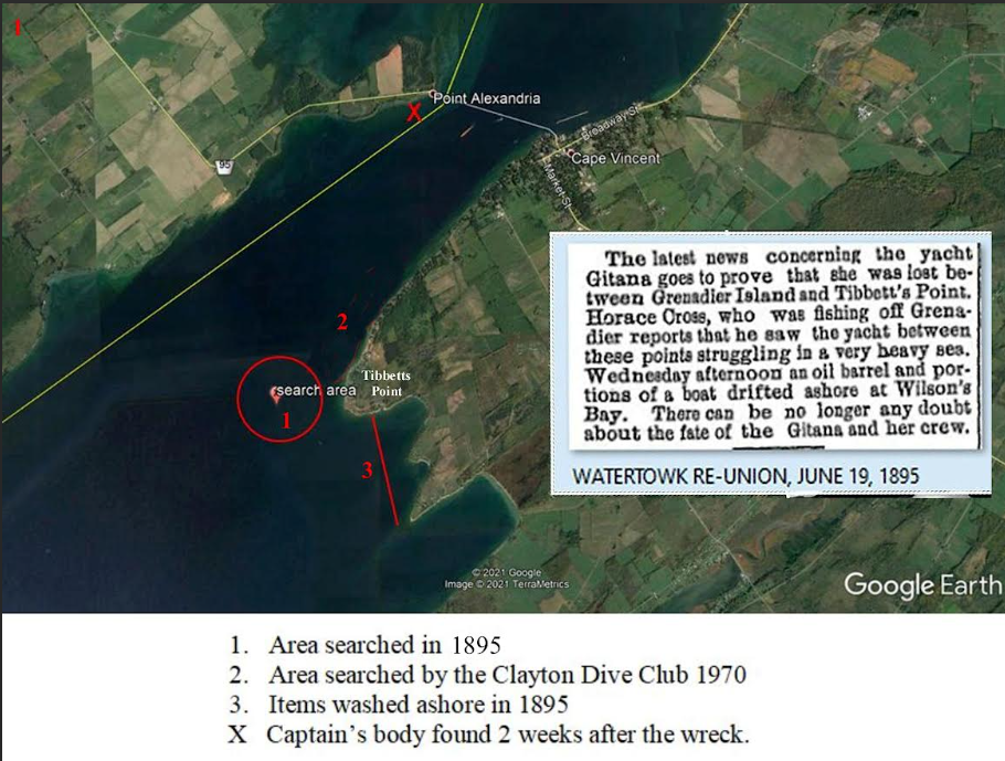 In 2010, while researching shipwrecks for their book Shipwrecks of the Thousand Islands, Dennis McCarthy and Skip Couch discovered the story of the Gitana. With side-scan sonar, an underwater imaging system used to create detailed pictures of large areas of a water body, the search for the Gitana started again. No wreck was found in the area a half a mile west of Tibbetts Lighthouse, where it was believed the Gitana had sunk in 1895. The elusive Gitana still proved difficult to find.