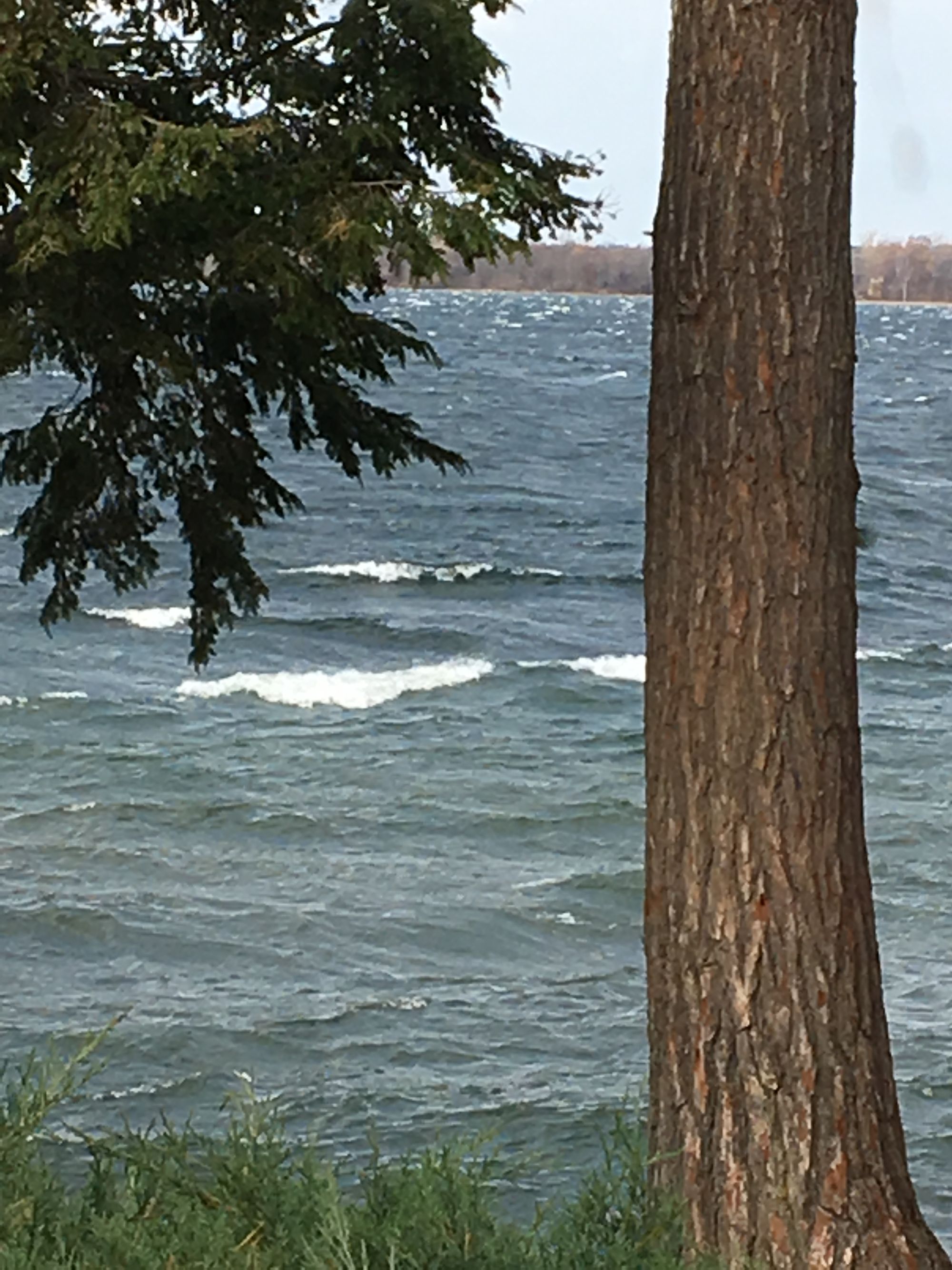 Strong southwest winds had been forecast for the day, with gusts on Lake Ontario supposed to exceed 100 kilometers per hour. JBJ was a little worried, but I was not, as westerly winds are not generally a problem on The Punts Islands. When going to town, we have several possible routes, one through the Forty Acres, and one avoiding them. I usually enjoy riding the big ones on the Forty Acres. As a child, my mother would not allow me to ride on roller coasters. My sympathies for big waves derive from my childhood thrills of rowing our old punt through them, shipping water, and then heading back as the water surged about in the boat. I mostly love a good storm!