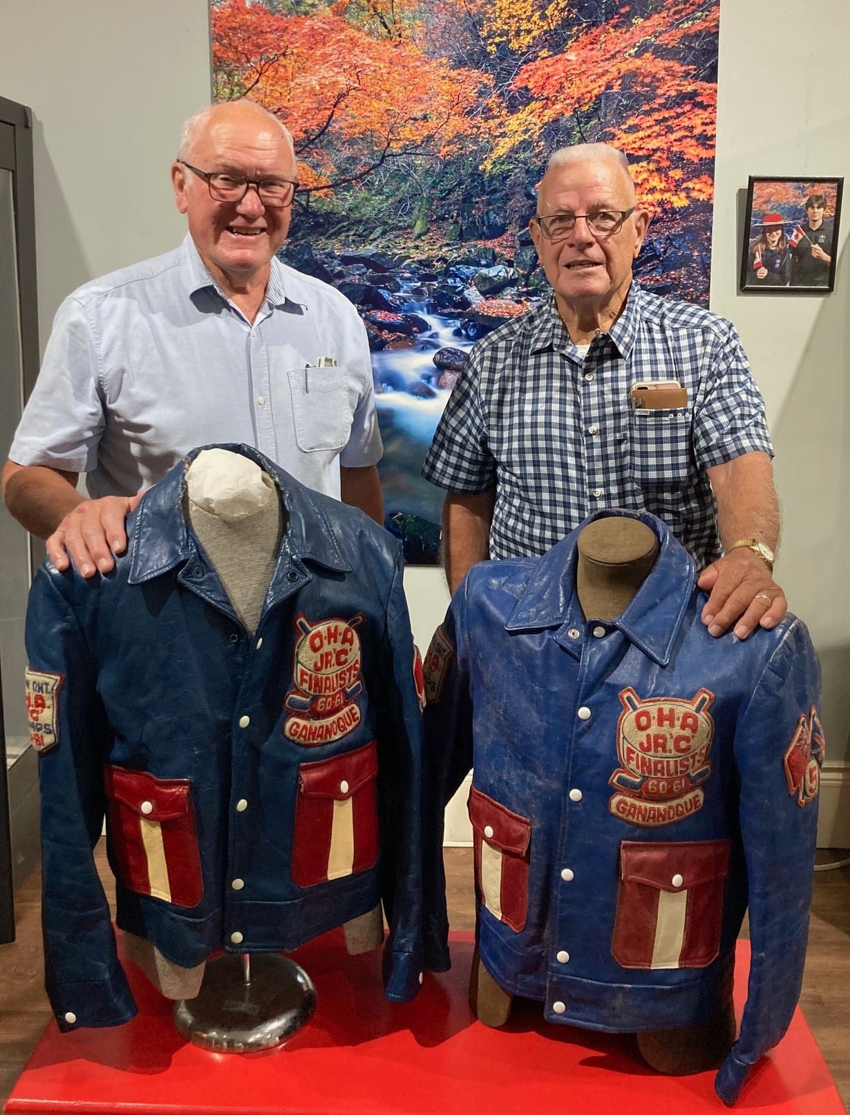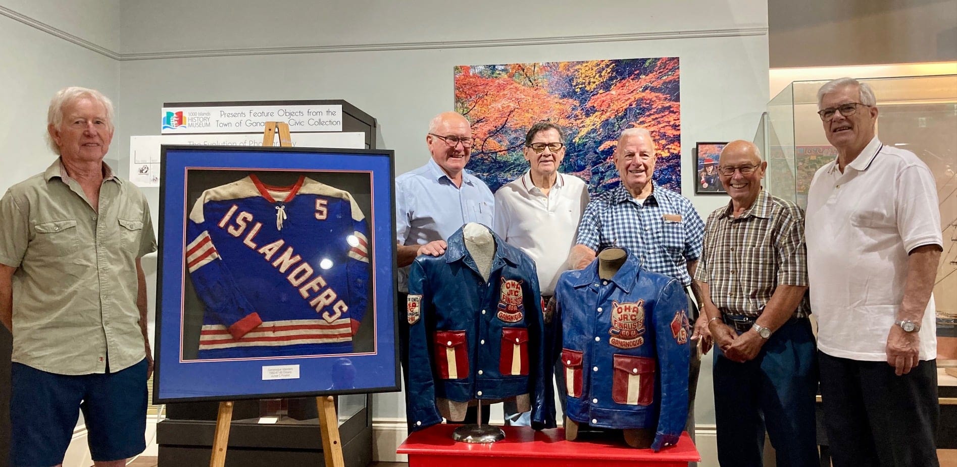 The 1,000 Islands History Museum is pleased to announce the acquisition of 1960/61 Islanders uniform jackets and sweater for their Town of Gananoque Civic Collection. On August 6, Jim McGlade’s original sweater and Stephen O’Meara’s #17 jacket were donated by original team members Joe Dennison, Steve O’Meara, Ralph Hall, Jim McGlade, Glen Carpenter, and Murray Roantree. [Photo courtesy 1000 Islands History Museum]