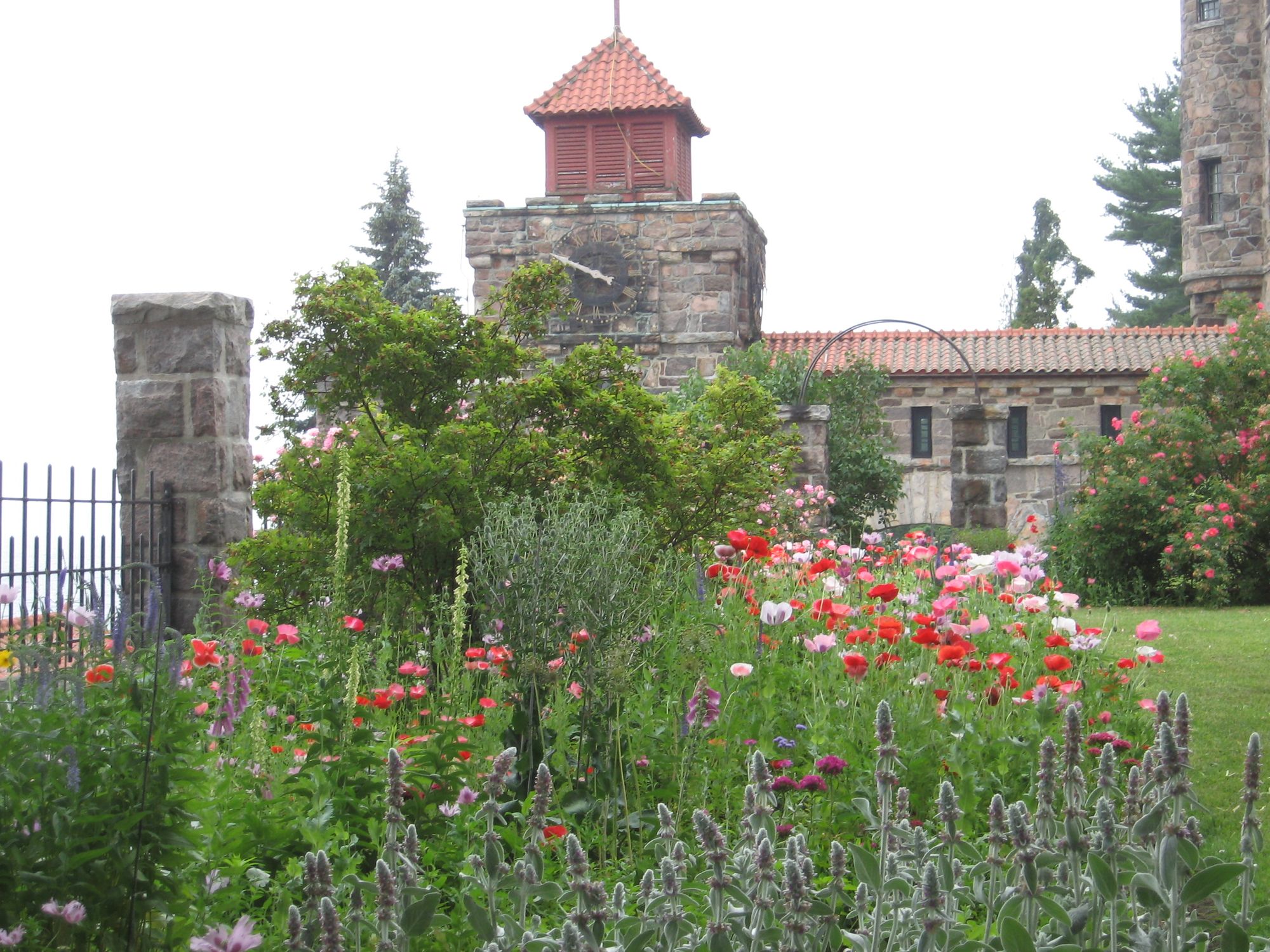 KM: "Tom Weldon, manager at that time, realized the castle had great potential as a wedding venue and in particular the courtyard area. It was apparent the area was a garden in the castle’s heyday. Stone benches and a table were all that remained. The challenging part of turning it back into a garden was deciding how to have vast areas of plantings while leaving enough lawn for the seating of wedding guests; as well as the large groups of visitors that pass through daily on tour. Basically, this was accomplished by incorporating a series of beds within and surrounding the lawn area. It was years after the garden was planted that Judy Keeler, the castle historian, found a photograph taken in the early years of the castle, showing the garden then, laid out almost exactly as designed now!