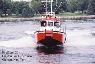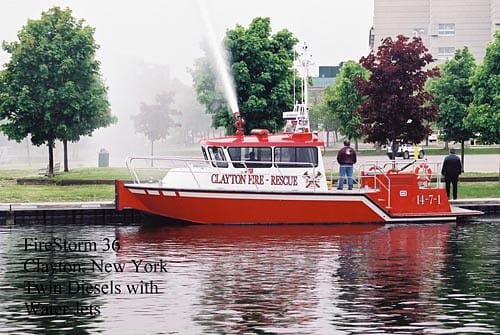 The village of Clayton has a dedicated 36 foot fire-boat built in 2003 by MetalCraft. The fire boat is named Last Chance. She is powered by a pair of Cummings 8.3 liter diesel engines that drive twin Hamilton 322 jet drives. She has a top speed of 37 knots or 42 miles per hour. Last Chance can carry a crew of eight, and is capable of transporting up to four patients. The fire boat has a Darley fire pump that can deliver 1,500 gallons of water per minute. That is lots of water for a vessel or structure fire. The boat is fitted with a 6.3 kw generator, and has a full compliment of electronics. This includes a GPS, chart plotter, radar, depth sounder, as well as a thermal imaging system suited for marine use (FLIR). And of course, Last Chance has marine radios and those designed for fire and law enforcement use.