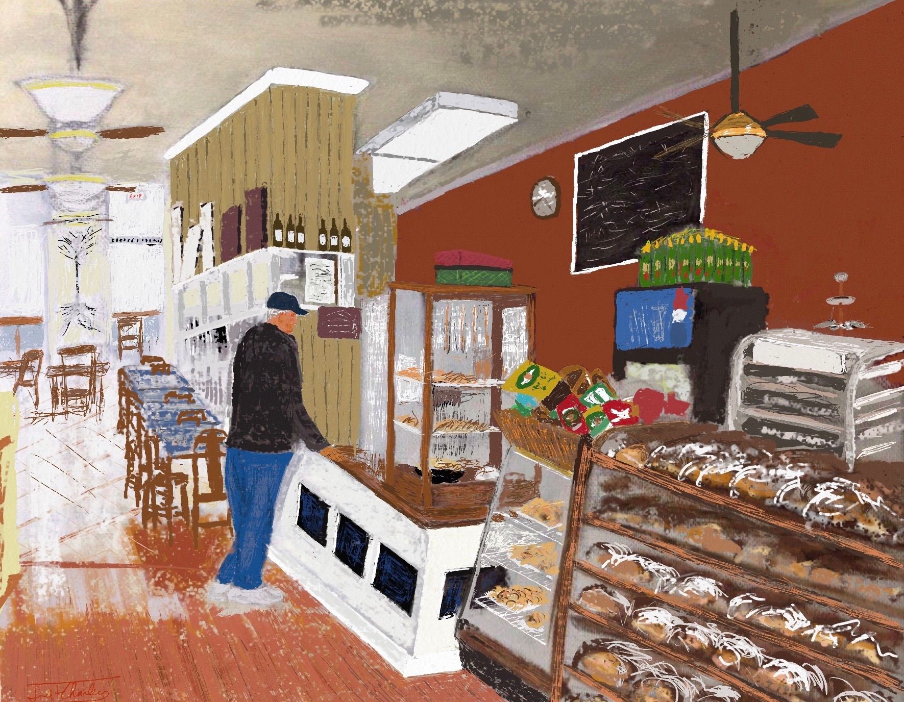 This drawing is from a photo on a day, like most mornings early in the summer of 2005, when I was looking for work, and I needed a cup of coffee and a pastry to get me going. At the time, the case visible on the right contained my sugared treat of choice, Napoleons. With one of those and a cup of coffee or a latte, I could sit out on the back deck and watch the boat traffic or read my book until they needed the stool I occupied. Carol was working at the Magical Swan in Alex Bay, and until I started with Antique Boat America, in June, this was my morning routine.