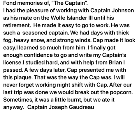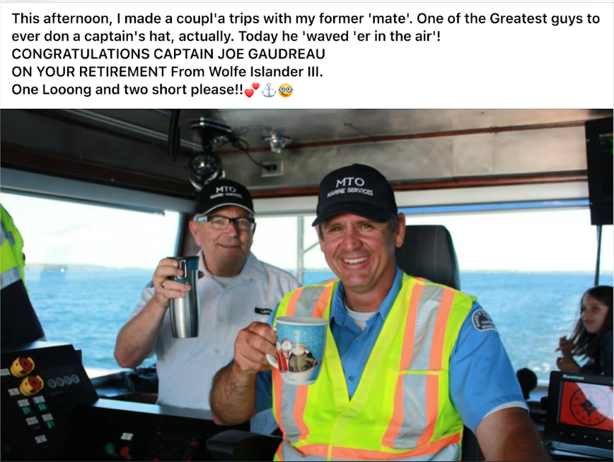 He was also a mentor to a former student Joseph Gaudreau. I was so happy when I learned Joseph had become a "Wolfe Islander III" Captain. I was also not surprised when I learned Brian and his family were present to mark Joseph’s last trip on the day of Joseph’s retirement. What a caring gesture.
