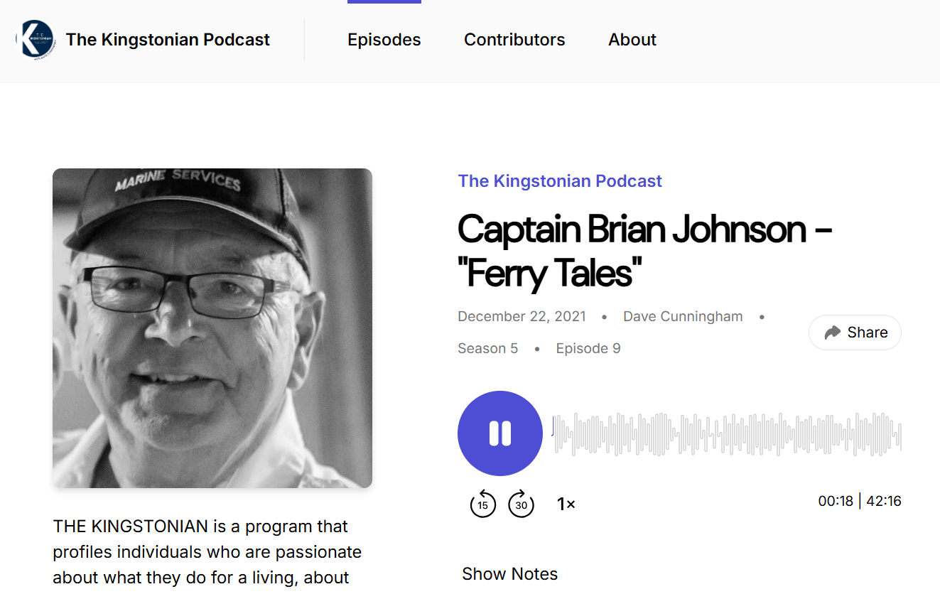 "Ferry Tales of Wolfe Island" by Captain Brian Johnson on YouTube: https://www.youtube.com/watch?v=2LXwJNW0Tds