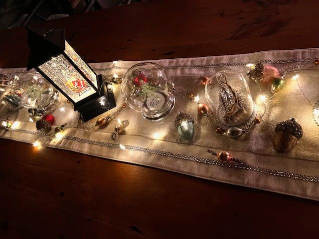 This copper candle holder has been with me since my high school days, and at Christmas, I use vintage Christmas light bulb-reflectors to dress them up. These reflectors were quite popular when I was a kid in the 1960s. I have a collection of large ones for the regular bulbs, and smaller ones used for the mini-light strings.