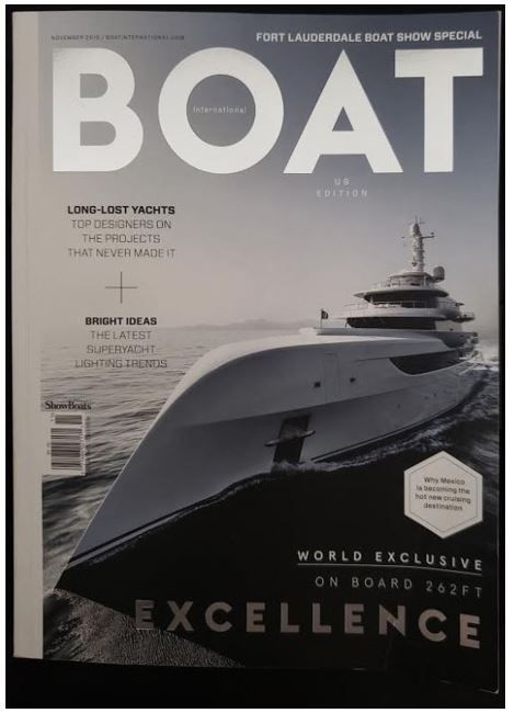 First, the cover featured the submarine lookalike “WORLD EXCLUSIVE/ONBOARD 262 EXCELLENCE described as “perhaps the most striking yacht ever to leave Abeking & Rasmussen’s ship yard in Bremen, Northern Germany. With her heavily reversed bow and acres of sheer glass windows, reflecting back…like a pair of aviator sunglasses…” The author marveled at its 33-foot bow, the exact shape of the beak of an American Eagle. Reading further, I was intrigued.