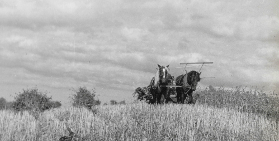 [Photograph notes by Manley Rusho: These photos were taken in 1942 by Elizabeth Bakewell. The photos were taken in fields owned by Elizabeth's husband, Allan Bakewell. The property was once part of the Charles Emery Estate, which included most of the land east of the Delaney Bay Bridge. Mr. Bakewell purchased this land as well as a couple of farms, restored an old grainery, and returned the fields into grain cultivation. Mr. Bakewell died in 1945 and the property was purchased by Barney Hineman. The photos were shared today by Penny Bakewell Linn.]