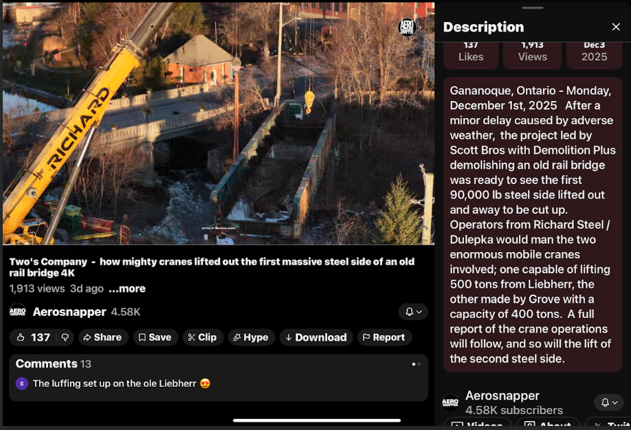 Gananoque, Ontario – Monday, December 1st, 2025. After a minor delay caused by adverse weather, the project led by Scott Bros with Demolition Plus demolishing an old rail bridge was ready to see the first 90,000 lb steel side lifted out and away to be cut up. Operators from Richard Steel / Dulepka would man the two enormous mobile cranes involved; one capable of lifting 500 tons from Liebherr, the other made by Grove with a capacity of 400 tons. A full report of the crane operations will follow, and so will the lift of the second steel side.