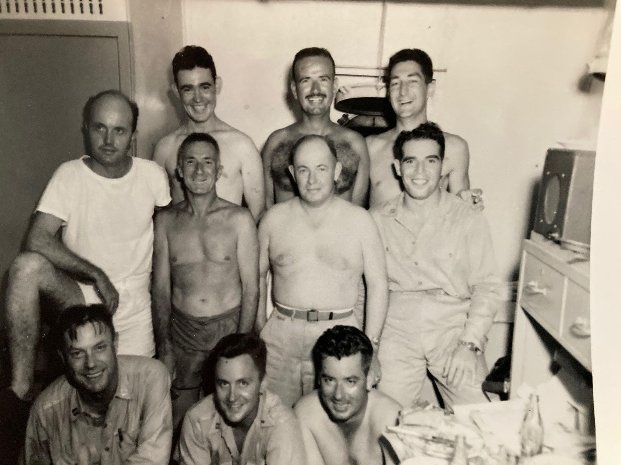 1) The photograph of the ten sailors was probably taken by the author of the letter to my father. The location was aboard the USS Tangier, a navy seaplane tender deployed in the south Pacific. It may well have been taken on the return voyage to the US, judging from the cheerful expressions on the sailors' faces.