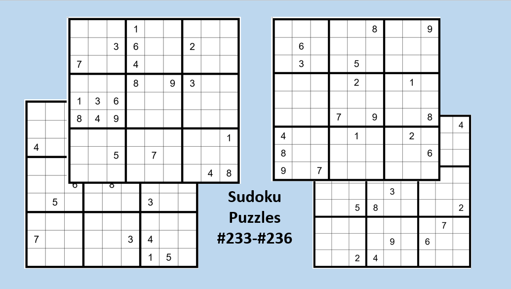 Clue for Puzzle #233 … Check out row 8. C4R8, C7R8, C8R8 & C9R8 are limited to options 2,3,6 and 9; therefore, C1R8, C2R8 and C6R8 are limited to options 1, 4 and 8. There is already 1 and 8 in column 1; therefore, C1R8=4.
