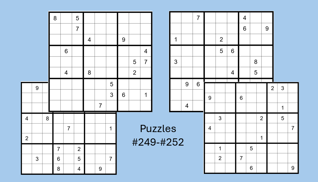 Here are links to all past Sudoku Puzzle Challenge beginning: February 2016, March 2016, April 2016, May 2016, June 2016, July 2016, August 2016, September 2016, October 2016, November 2016, December 2016, January 2017, February 2017, March 2017, April 2017, May 2017, June 2017, July 2017, August 2017, September 2017, October 2017, November 2017, December 2017, January 2018, February 2018, March 2018, April 2018, May 2018, June 2018, July 2018, August 2018, September 2018, October 2018, November 2018, December 2018, January 2019, February 2019, March 2019, April 2019, May 2019, June 2019, July 2019, August 2019, September 2019, October 2019, November 2019, December 2019, January 2020, February 2020, April 2020, May 2020, June 2020 and July 2020, August 2020, September 2020, October 2020, November 2020 and December 2020, January 2021, February 2021, March 2021, April 2021, May 2021, June 2021, July 2021 , August 2021, September 2021 , October 2021, November 2021, December 2021, January 2022, February 2022, March 2022, April 2022 , May 2022, June 2022, July 2022 , August 2022, September 2022, October 2022, November 2022, December 2022, January 2023, February 2023, March 2023, April 2023, May 2023, June 2023, July 2023, August 2023, September 2023, October 2023, November 2023, December 2023 and January 2024, February 2024, March 2024, April 2024, May 2024, June 2024, July 2024, August, 2024, September 2024, October 2024, November 2024, December 2024 January, 2025, February 2025, March 2025, April 2025, and March 2025.