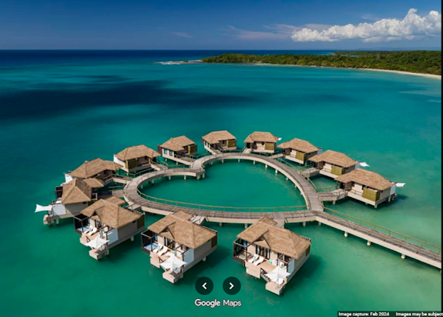 I hesitate to tell you about our accommodations lest you get the wrong idea and my wife never lets me deploy again! We are usually housed in a school gym, some warehouse, or a FEMA emergency trailer, on Red Cross cots. Here, we were in rooms at the Sandals Luxury Resort, often used by honeymooners or folks on romantic get-aways. People gladly pay $7000+ a week and some bungalows (below) are $3700 a night. It is all inclusive, with meals served by a butler, endless booze, and all amenities. You may have seen this ad for the place.