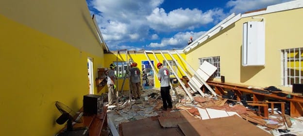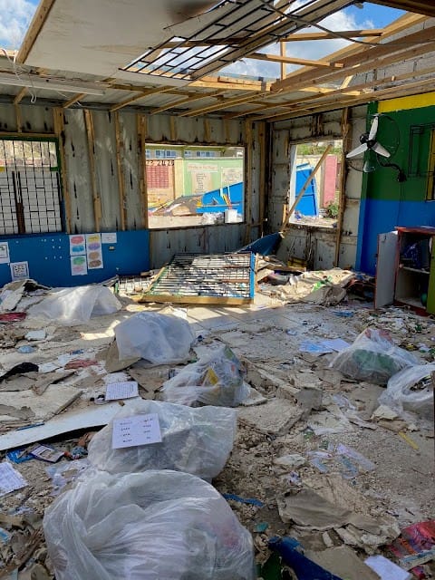 However, we are not here to help Sandals; they hired 600 of their own people. We are here to tarp roofs where sometimes there are only walls left. We cleaned up the debris at four schools (and tarped the roofs) and cut trees that blocked access, so that kids could return to their classes. When the kids return, they get fed, educated, get back into a social routine, and parents can return to work. The schools we opened allowed 500 families to send their kids back to school, well over 1,000 kids in all. The ministry of education told us there were 352 schools that needed to be tarped across the island.