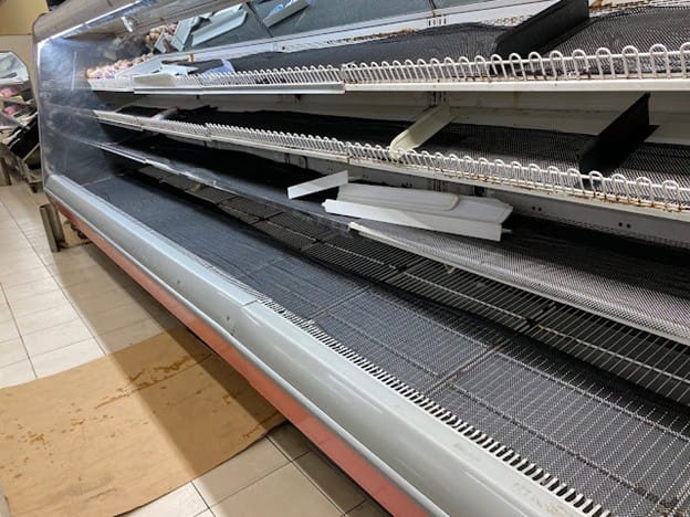 Store shelves; M: The tree we cut blocking access to a school. R: Most roofs are of this corrugated metal. In two weeks, I don't recall seeing an intact one. The metal gets wrapped around trees and power poles like aluminum foil.