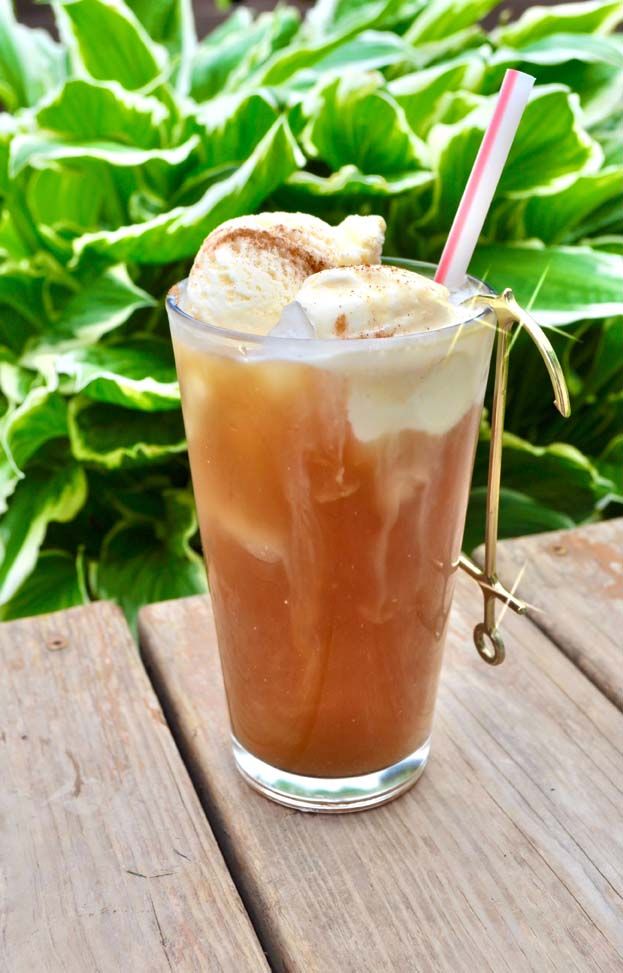 In a tall glass, again filled with ice, pour in your cooled coffee from the shaker and leave a little room for one large scoop of the French Vanilla ice cream. Top with a sprinkle of ground cinnamon.
