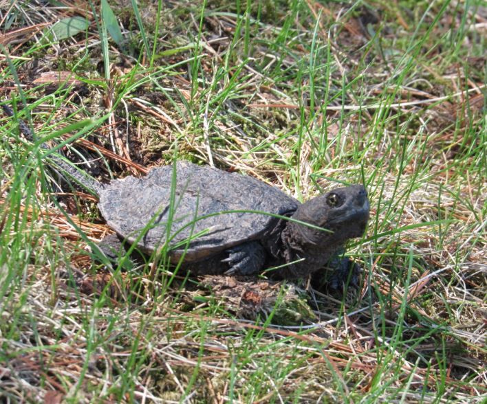 I saw the same creature a few years later. I’d been hiking along South Bay Trail when a strange sound caught my ear. It sounded like a goon dragging a bad leg: crunch, slide, crunch, slide. I searched the underbrush and saw a giant snapping turtle coming down from the Pond Loop trail and heading toward the water. It paused when it saw me. I was disappointed that I didn’t have my camera with me. I was certain that it was the large turtle I’d seen while kayaking a few years before. It looked more enormous on land.