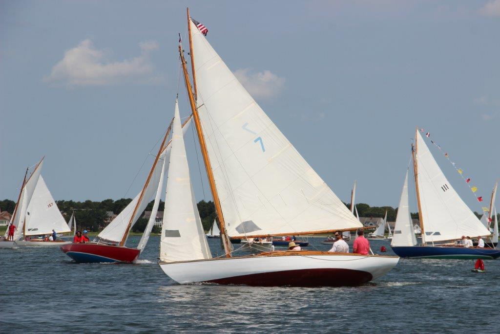 In 1913, fourteen members of the Wianno Yacht Club placed orders with Crosby for the new design, in order to start a racing fleet. The wood sloops were built with centerboards for the shoal waters of Nantucket Sound, which is known for its many sand bars. The spars are solid Sitka spruce, and the sailing rig has a very large mainsail of 294 square feet, and a relatively small jib of 72 square feet. This is a very traditional sail design, with the gaff on the top of the mainsail. Spinnakers are flown for downwind sailing.